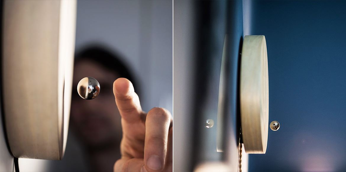 “Story”外型十分簡約,只有一塊高 42.5 毫米、直徑 268 毫米的胡桃木或白蠟?zāi)局瞥傻膱A形鐘面,以及一粒直徑 16 毫米的懸浮金屬球體。沒有任何時間刻度,也沒有指針,但懸浮的金屬球體會以運(yùn)轉(zhuǎn)的形式來標(biāo)記時間的軌跡,令人不禁聯(lián)想到宇宙中圍繞太陽公轉(zhuǎn)的星球。
