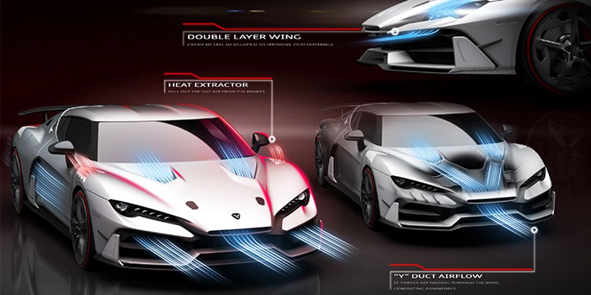 車前方的設(shè)計靈感源于性能最強(qiáng)悍的車型:單座賽車。車前鼻的造型特征六邊形,來源于2016年推出的概念車GTZero,并將在未來延續(xù)使用。這一構(gòu)造與側(cè)方的兩個進(jìn)氣口共同工作,保證最佳的進(jìn)氣性能??諝鈴闹醒脒M(jìn)氣口進(jìn)入,經(jīng)過“Y形”通道,從車蓋上方的兩個開口出來,由此產(chǎn)生下壓力。后擾流板的下方翼片使這一空氣動力氣流下壓力最大化。