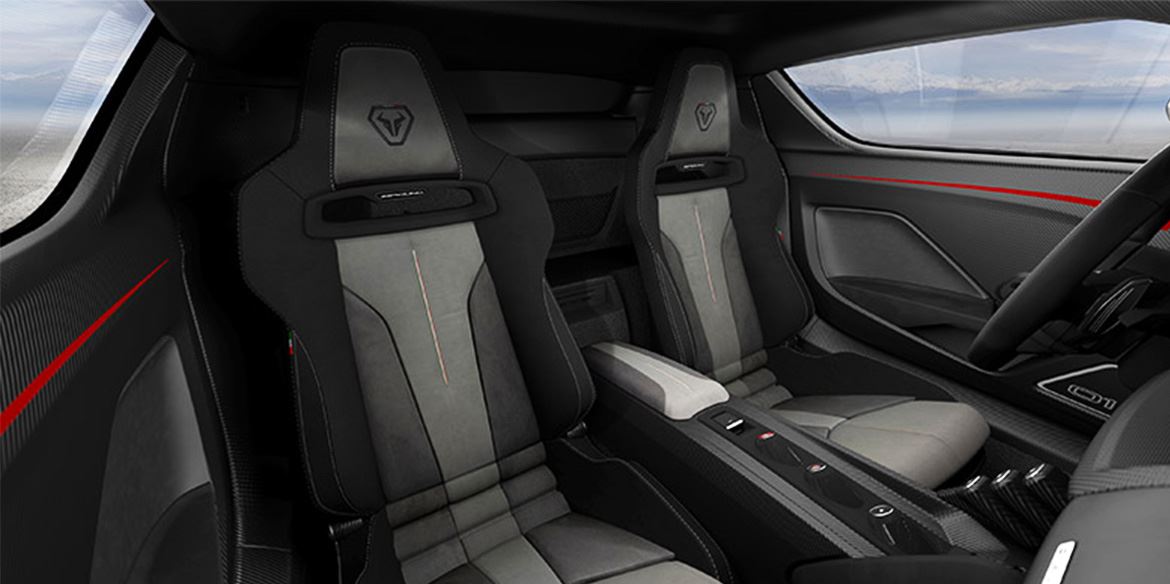 汽車內(nèi)飾簡潔而又華貴,與外部造型相得益彰:碳纖維材質(zhì)是設(shè)計風(fēng)格的主角。門板、儀表板和中控臺都完全采用這種材料制成。駕駛座艙為數(shù)字模式,包含汽車的所有主要控制。儀表板的中央有三個小顯示器,控制所有空調(diào)功能。