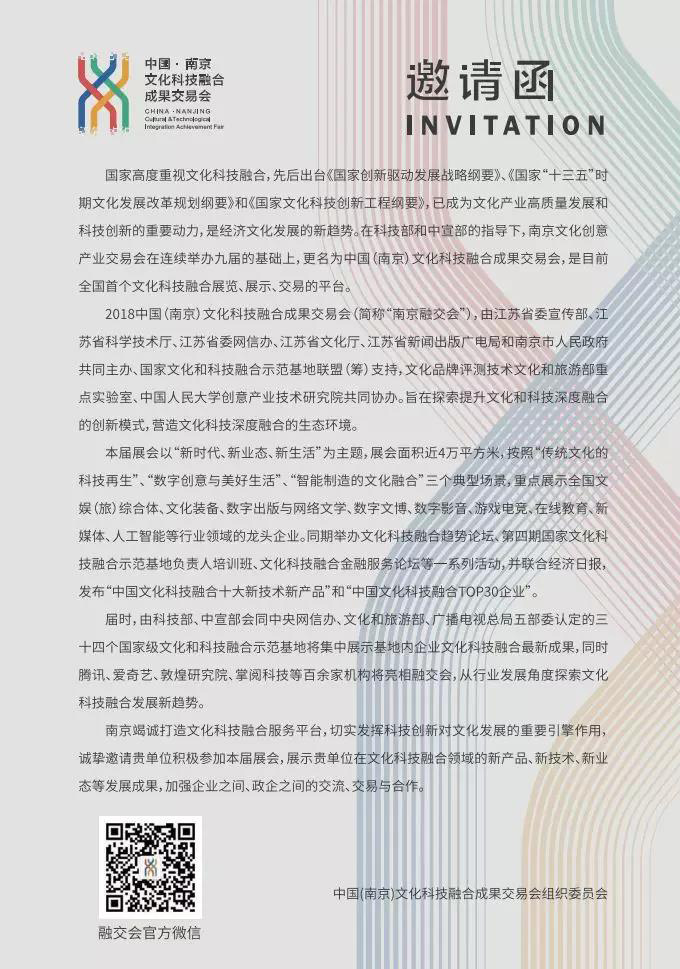 2018“中國(南京)文化科技融合成果交易會”,(以下簡稱“南京融交會”),于2018年11月2日-4日在南京國際博覽中心(元通)召開,這是全國首個(gè)也是唯一一個(gè)文化科技展覽、展示、交易平臺。